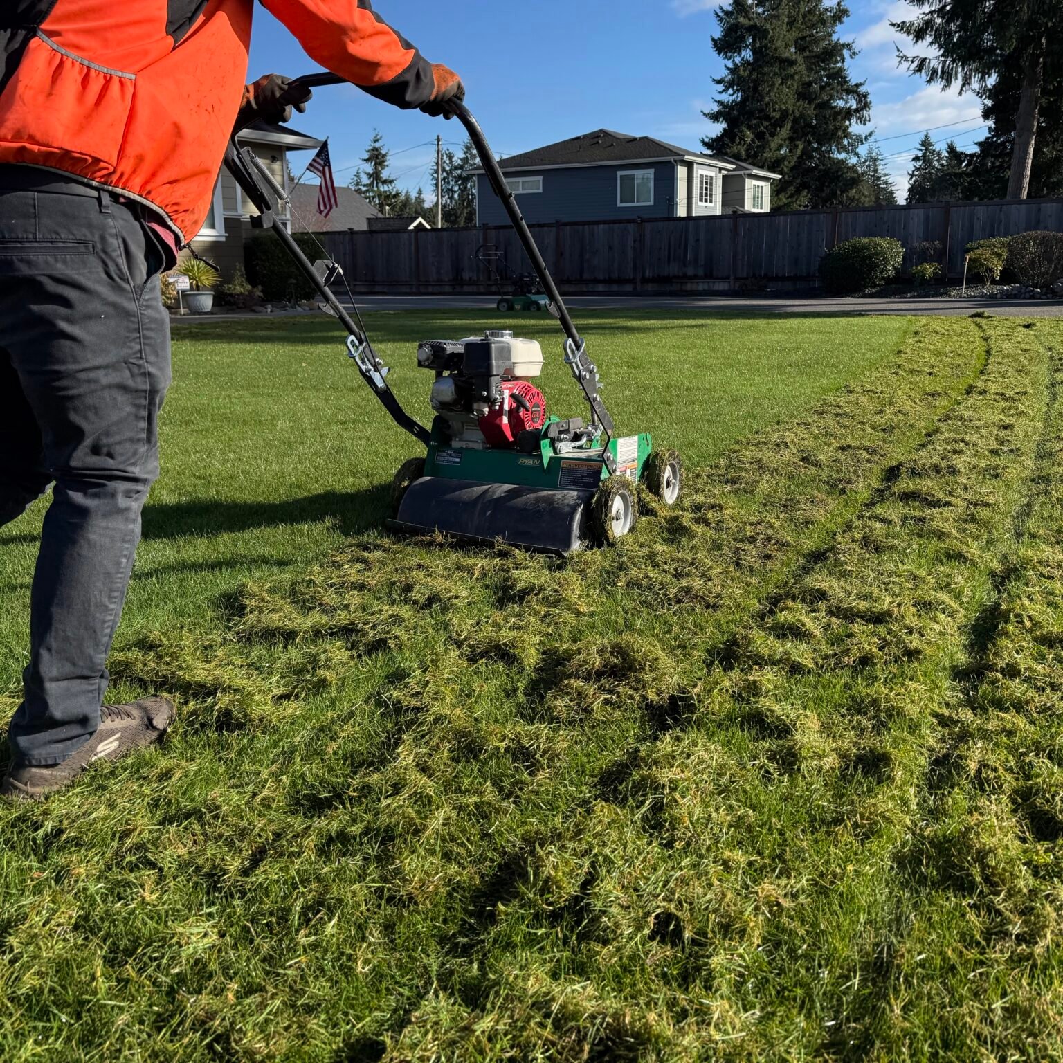 For the best results in the Pacific Northwest, we recommend professional lawn dethatching as needed — typically in early spring or early fall. Western Washington lawns tend to develop heavy organic buildup due to moisture and moss pressure. Periodic dethatching prevents that layer from suffocating the turf and restricting airflow. For a complete lawn reset, many homeowners combine dethatching with overseeding and fertilizing to restore thickness and improve long-term health.